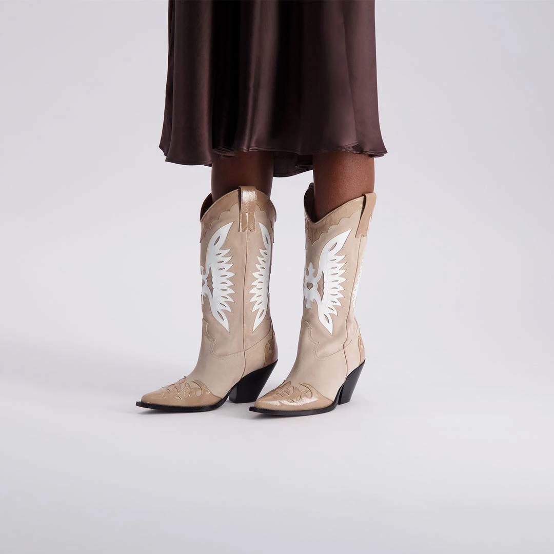 Ensure your style is on trend with these wonderful sand-coloured suede cowboy boots featuring beautiful, outstanding and carefully sewn detailing in contrast sand leather and white patent.