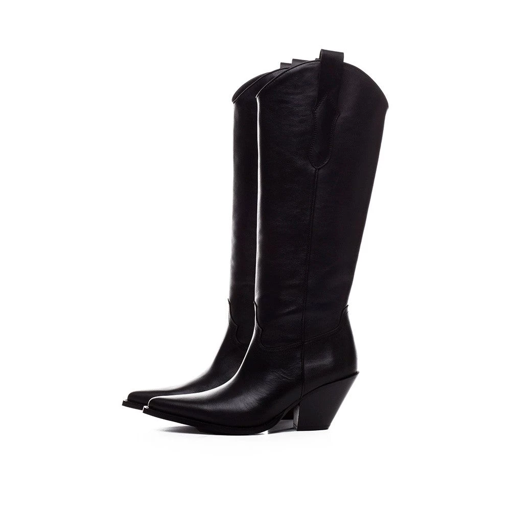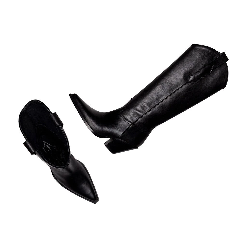 High black leather boots. Wide cone heel measuring approximately 7.5 cm.